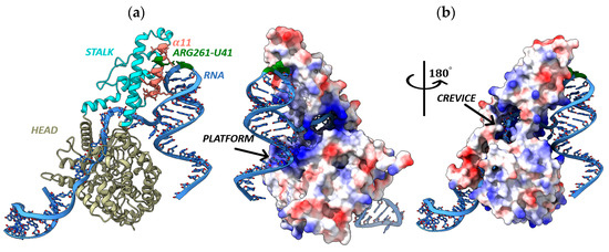 It was found that the Cys to Ser substitutions at position 40 aa (Cys40–Ser40) in YEZV N Chita 2024-1 isolate, Ser145–Tyr145 in the YEZV N Khabarovsk 2024-1 and Primorye 2024-1 isolates, Pro502–His502 in the YEZV N Khabarovsk 2024-1 and Primorye 2024-1 isolates are located in the “head” domain of N YEZV and do not affect regions important for N functioning. However, the Lys261–Arg261 substitution occurs in the α11 structure of YEZV N Chita 2024-1 isolate, presumably in the pocket of interaction with viral RNA [28]. Investigation of the electrostatic potential on the surface of the N YEZV complex structure and the YEZV S segment RNA fragment of 62 nucleotides in size (3′-GAUUGUGGAUCCACUUAUCCAGCUCUUCUCUAGUCUUUGCU41UCAAUCAGACGUCCAUCUCCG-5′) showed that YEZV RNA interacts with N YEZV in the positively charged region and confirms the interaction of YEZV RNA Uracil at position 41 with YEZV N at position 261 aa (Figure 5). There is a large positively charged cavity (crevice and platform) located at the center of the N YEZV “head” domain, and a positively charged region in the N YEZV “stalk” domain near to the “head” domain (Figure 5b). The RNA binding region in the YEZV N is formed by a cluster of amino acids: Ser40-Ser145-Arg261-Pro502 (Figure S8). The N binds each RNA segment and forms ribonucleoprotein complexes, the functional template of the L protein RdRp for transcription and replication [17].