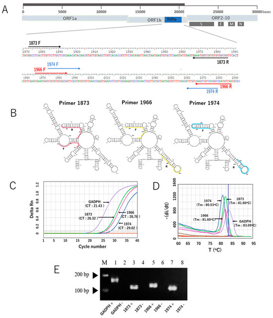 The three RdRp primer pairs and their secondary structures and characteristic performance in the SYBR Green-based RT-qPCR assay for the detection of SARS-CoV-2. (A) The three RdRp primer pairs with respect to their location in the RdRp gene and the whole genome. Primers 1873, 1966, and 1974 are indicated in light brown, red, and blue colors, respectively. F represents the forward primer, and R represents the reverse complementary sequence of the reverse primer. (B) Visualization of RNA secondary structure of the RdRp gene fragments amplified using the forward and reverse primers. (C) Representative amplification curves of the SYBR green assays with the three different RdRp primers and GADPH gene as a control primer pair, using in vitro-transcribed RNA. (D) Melting curves of the products amplified with the three RdRp primers and GADPH gene. (E) Distinct PCR products amplified with three different primers and the GAPDH gene (lines 1, 3, 5, and 7) were visualized on a 2% agarose gel. The PCR product sizes for the respective primers are 170 bp (GAPDH), 114 bp (1873), 123 bp (1966), and 109 bp (1974). Lines 2, 4, 6, and 8 indicate negative control of the assays (nuclease-free water). Note: the arrows mark the bands with molecular weights of 100 bp and 200 bp.