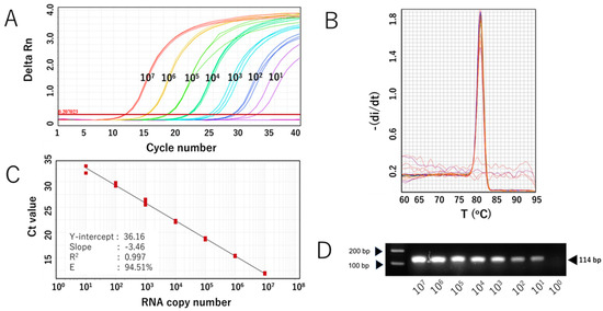 The sensitivity of the SYBR Green-based assay with RdRp 1873 as primer (RdRp 1873 assay) was then evaluated. In vitro-transcribed RNA containing the target gene was serially diluted to concentrations ranging from 107 to 101 copies/μL and used for RT-qPCR. The assay was performed in triplicate. The RdRp 1873 assay successfully amplified the standard RNA down to 101 copies/μL; however, one replicate at this concentration failed to amplify. No amplification was generated at 100 copies/μL (Figure 2A). Melting curve analysis again validated the amplification curve findings, showing a single peak with a Tm of approximately 81.0 °C in all samples (Figure 2B). When SYBR Green-based RT-qPCR products were verified through gel electrophoresis, single amplicons of the expected size were revealed (Figure 2C). Furthermore, the Ct value showed a linear correlation with the logarithm of RNA copy number, with an R2 = 0.997 (Figure 2B). The standard curve equation was Y = −3.46X + 36.16, and the amplification efficiency (E) was 94.51%. These parameters indicate that the RT-qPCR amplification of the RdRp 1873 assay is efficient [28]. Overall, the findings from the analytical sensitivity experiment using in vitro RNA standards demonstrate that our RdRp 1873 SYBR Green-based assay is sufficiently sensitive for detecting SARS-CoV-2.