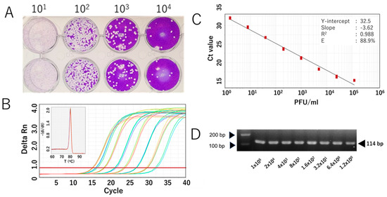 Analytical sensitivity of the RdRp 1873 assay, determined using the authentic SARS-CoV-2 Wuhan strain. (A) Representative plaque assay of the Wuhan strain in Vero-TM cells to determine virus titer. (B) Amplification curves of the amplicons of the original Wuhan strain (serially diluted fivefold) after RdRp 1873 assay. The corresponding melting peak is shown in the inset panel. (C) Standard curves generated by the RdRP 1873 assay using the Wuhan strain. Virus titer (PFU/mL, log starting quantity) is indicated and plotted against the mean cycle threshold (Ct) value. The coefficient of determination (R2) and the equation of the regression curve (Y) were calculated. (D) Representative RT-qPCR amplicons visualized in a 2% agarose gel, showing a single band of 114 bp. Note: the arrows on the left indicate bands with molecular weights of 100 bp and 200 bp.