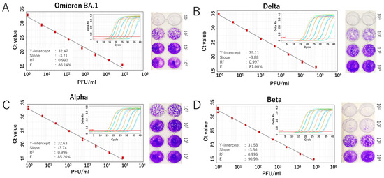 Analytical sensitivity of the SYBR Green-based RT-qPCR for detecting SARS-CoV-2 variants. Standard curves generated from fivefold serial dilutions of RNA extracted from infected culture fluid of the virus variants are shown for (A) Omicron BA.1 variant, (B) Delta variant, (C) Alpha variant, and (D) Beta variant. A representative plaque assay to determine the viral titer of each strain is shown in the right panel. The coefficient of determination (R2), Y-intercept, slope, and PCR efficiency (E) were calculated for each variant. Amplification curves for each variant are also displayed in the inset panel.