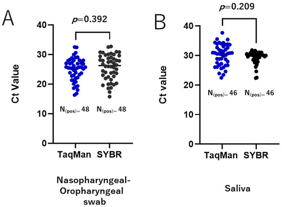 Validation of the SYBR Green-based RT-qPCR method in clinical samples. A total of 135 clinically relevant samples were tested, comprising 88 nasopharyngeal and oropharyngeal swab samples (48 positive and 40 negative) and 47 saliva samples (46 positive and 1 negative). Agreement between the TaqMan-based assay and the RdRp 1873 SYBR Green-based assay is shown for nasopharyngeal and oropharyngeal swab samples (A) and saliva samples (B). A p-value of <0.05 is considered statistically significant.