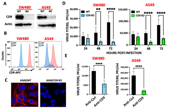 SARS-CoV-2 infections. WT and CD9 KO SW480 and A549-ACE2 cells were seeded in 24-well plates at 2 × 105 cells per well. The following day, cell monolayers, at 95% confluency, were infected with SARS-CoV-2 at a multiplicity of infection (MOI) of 0.2, in medium DMEM supplemented with 2% fetal bovine serum, and 50 mg/mL gentamicin, all from Gibco (Grand Island, NY, USA). At 24, 48, and 72 h post-infection (hpi), cell culture supernatants were collected and titrated in Vero E6 cells as previously described [34].