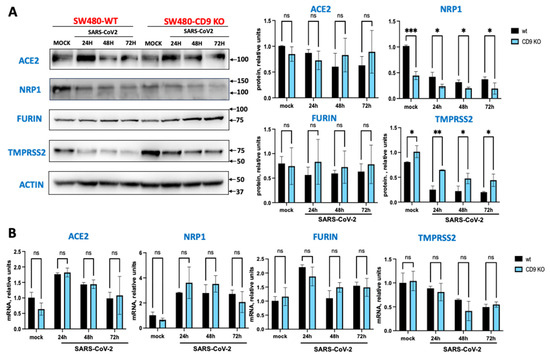 Blocking CD9 expression decreases NRP1 protein levels. Given the results showing that ACE2 is essential for SARS-CoV-2 entry into the cells, that furin, TMPRSS2 and NRP1 facilitate SARS-CoV-2 cellular entry, that tetraspanin-enriched microdomains (TEMs) are known to contain a variety of cell-surface proteases [36,39], and that TEMs may contain coronavirus receptors and priming proteases [25,26], we hypothesized that CD9 could be affecting the expression or the membrane localization of ACE2, furin, TMPRSS2, and NRP1. To this end, we performed Western blot assays using antibodies specific for these proteins in SW480/WT and SW480/CD9 KO cells, either mock infected or infected with SARS-CoV-2 for 24, 48, and 72 h (Figure 2A). Of note, the expression of NRP1 diminished both in mock-infected and SARS-CoV-2-infected SW480/CD9 KO cells compared to mock-infected and SARS-CoV-2-infected SW480/WT cells (Figure 2A), suggesting that CD9 may affect the expression or stability of NRP1. On the other hand, CD9 KO cells exhibit a slight increase in TMPRSS2, showing sustained elevation across all time points evaluated (Figure 2A), highlighting a regulatory role for CD9 in controlling the expression of SARS-CoV-2 entry factors. To further analyze whether CD9 expression increases NRP1 protein levels, the levels of NRP1 were also analyzed in A549-ACE2/WT and A549-ACE2/CD9 KO cells, showing a reduction in the NRP1 levels in the A549-ACE2/CD9 KO cells compared to the A549-ACE2/WT cells in SARS-CoV-2-infected cells (Supplementary Figure S1). To analyze whether CD9 might affect the expression of NRP1 and the other SARS-CoV-2 entry molecules at the transcript level, the levels of mRNA were analyzed by RT-qPCR in both WT and CD9 KO SW480 cell lines, either mock-infected or infected with SARS-CoV-2 for 24, 48, and 72 h. No significant differences at the mRNA levels were observed between SW480/WT and SW480/CD9 KO cells, either in mock-infected conditions or in SARS-CoV-2 conditions (Figure 2B), suggesting that CD9 does not affect the transcription levels of NRP1 or any of the other entry factors.