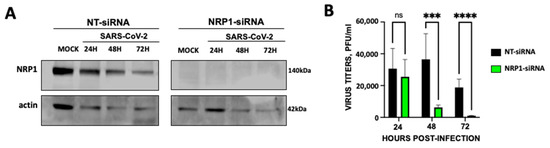 NRP1 facilitates SARS-CoV-2 infection. A549-ACE2 WT cells were silenced with an siRNA specific for NRP1 or with a non-targeted (NT) siRNA as control. (A) Silencing efficiency was confirmed by Western blot in mock infected and SARS-CoV-2-infected cells after 24, 48, and 72 h post-infection, using an antibody specific for NRP1 and an antibody specific for actin as control. Two experiments were performed, showing similar results. (B) Human A549-ACE2 cells were transfected with a non-targeted (NT) or an NRP1-specific siRNA. At 24 h post-transfection, the cells were infected with SARS-CoV-2. Cell culture supernatants were collected at 24, 48, and 72 hpi and titrated by a lysis plaque assay on Vero E6 cells. Error bars represent the means and standard deviations (SD) of results from three independent experiments, including triplicate wells in each experiment. Ns, p > 0.05, * p < 0.05, ** p < 0.01, *** p < 0.001, **** p < 0.0001 (for comparison between cells transfected with the NT siRNA and the cells transfected with the NRP1 siRNA, using an unpaired two-tailed Student’s t-test).