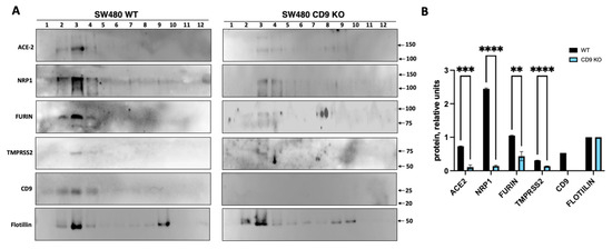 CD9-enriched membranes contain the SARS-CoV-2 receptor ACE2 and S-cleavage proteases. Previous results suggested that tetraspanin- and particularly CD9-enriched microdomains contained the coronavirus receptors APN, DPP4, CEACAM, and ACE2; and the protease TMPRSS2 [25], suggesting that CD9 might facilitate SARS-CoV-2 infection by bringing in proximity the SARS-CoV-2 receptor and the proteases that facilitate the viral entrance into the cellular plasmatic membrane. To this end, to analyze whether CD9, ACE2, NRP1, and the proteases furin and TMPRSS2 are located in the same membrane microdomains, a fractionation experiment using the Brij98 detergent was performed in a similar way as previously reported [36]. Lysates from SW480/WT and SW480/CD9 KO cells were layered beneath a discontinuous sucrose step gradient, from which fractions were recovered from top to bottom after overnight ultracentrifugation for Western blot analysis, and 12 fractions were collected. Interestingly, CD9, ACE2, NRP1, and the transmembrane proteases TMPRSS2 and furin were mainly detected in the same fractions, which were the detergent-resistant membrane (DRM)-fractions, as observed by Western blot analysis using antibodies specific for each of these proteins (Figure 4A), suggesting that these proteins are located to the same membrane microdomains. As a control, we visualized the distribution of the established lipid raft marker flotillin-1 [40,41], which was also mainly present in the DRM fractions (Figure 4A), as previously reported [36]. To analyze whether CD9 affects the location or the expression levels of ACE2, NRP1, and the proteases TMPRSS2 and furin, the presence of these proteins was compared among SW480/WT and SW480/CD9 KO cells. Western blot analysis revealed that the presence of ACE2, NRP1, and the proteases TMPRSS2 and furin was significantly lower in the DRM fractions containing CD9 (as observed in the WT cells), in the SW480/CD9 KO cells compared to the SW480/WT cells (Figure 4B). To reinforce these results, the same fractionation studies were performed in the A549-ACE2/WT and A549-ACE2/CD9 KO cells (Supplementary Figure S2), showing that CD9 was mainly located at the same fractions as ACE2, NRP1, furin, and TMPRSS2. However, in this case, whereas the proteins ACE2, NRP1, furin, TMPRSS2, CD9, and flotillin were preferentially expressed at fraction 5, in the A549-ACE2/WT cells, the proteins ACE2, NRP1, and furin were preferentially visualized at fraction 3 in the A549-ACE2/CD9 KO cells, and TMPRSS2 could not be detected (Supplementary Figure S2A). Furthermore, the amounts of ACE2, NRP1, furin, and TMPRSS2 were significantly lower in the A549-ACE2/CD9 KO cells, in comparison to the A549-ACE2/WT cells (Supplementary Figure S2). These results strongly suggest that CD9 affects the protein levels of ACE2, NRP1, and the proteases TMPRSS2 and furin within the cellular membranes’ microdomains, and suggest that CD9 likely helps to bring together the host factors ACE2, NRP1, and the proteases TMPRSS2 and furin, facilitating viral infectivity.