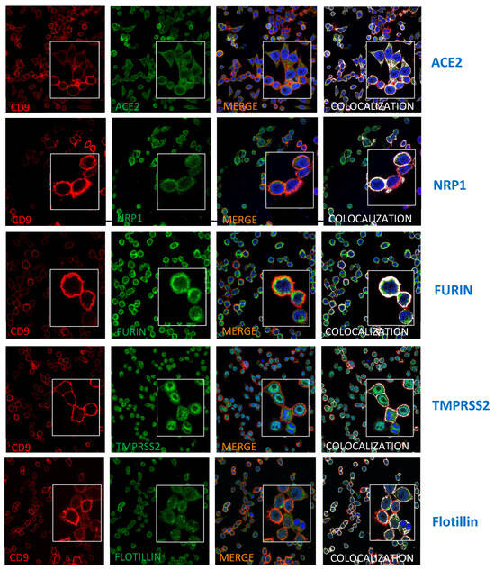 CD9 partially colocalizes with ACE2, NRP1, and the proteases TMPRSS2 and furin. To reinforce the results showing that CD9 likely facilitates the proximity of ACE2, NRP1, and the proteases TMPRSS2 and furin, immunofluorescence and confocal studies were assessed. To this end, SW480 cells were stained with antibodies specific for CD9, together with antibodies specific for ACE2, NRP1, TMPRSS2, furin, and flotillin, as control (Figure 5). A partial colocalization in the peri-plasmatic membrane region between CD9 and ACE2, NRP1, TMPRSS2, furin, and flotillin was observed, suggesting that these proteins might be in the same membrane microdomains (Figure 5).
