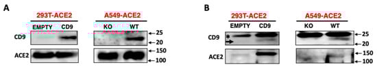 Co-immunoprecipitation assays. 293T-ACE2 cells (100 mm plate format) were transfected with a plasmid expressing CD9 or the empty plasmid, using lipofectamine 3000 (Thermo Fisher Scientific, Waltham, MA, USA), according to the manufacturer’s instructions. At 24 h post-transfection, the cells were lysed in the co-immunoprecipitation buffer (NaCl 250 mM; EDTA 1 mM; 50 mM TrisHCl, pH 7.5; Brij98 0.5%) containing protease (ThermoFisher Scientific, Waltham, MA, USA) and phosphatase (Merck, Rahway, NJ, USA) inhibitors, and cleared by centrifugation. Alternatively, A549-ACE2 WT and A549-ACE2 CD9 KO cells (100 mm plate format) were lysed in the co-immunoprecipitation buffer containing protease and phosphatase (Merck, Rahway, NJ, USA) inhibitors, and cleared by centrifugation. Protein G-dynabeads (Thermo Fisher Scientific, Waltham, MA, USA, 1004D) were incubated with the anti-CD9 antibody (Thermo Fisher Scientific, Waltham, MA, USA, 1004D) overnight at 4 °C, and washed three times with Tris-buffered saline (TBS). Then, the anti-CD9 antibody conjugated to protein G-dynabeads was incubated with the cleared cell lysates for 4 h at room temperature. The cellular extracts combined with the affinity resins were washed five times in TBS buffer containing 0.05% Tween-20. The immunoprecipitated proteins were unbound using 0.1 M glycine buffer at pH 2.4, denatured in loading buffer, and incubated at 95 °C for 5 min. Then, samples were analyzed by electrophoresis and Western blot as described above.