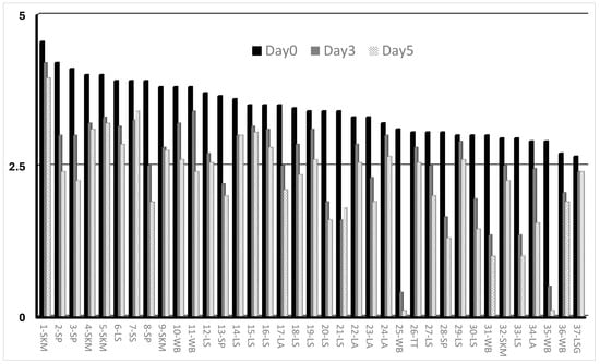 Histogram chart of PPR vaccines titres following incubation at 40 °C after day 3 and day 5. The X-axis represents the different vaccines, while the Y-axis shows the log10 of vaccine titre after incubation at 40 °C. All the vaccine batches at incubation time with a titre above the 2.5 log10 TCID50/mL meet the reference standard titre of the PPR vaccine.