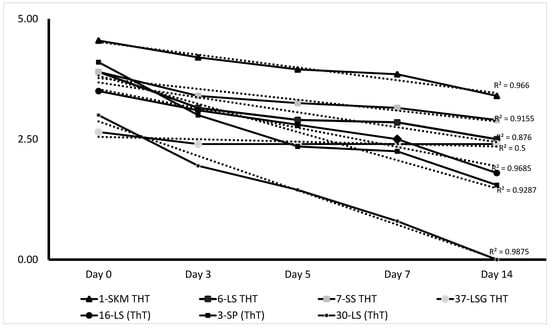Additionally, the seven batches submitted as ThT PPR vaccines incubated up to 14 days at 40 °C and 45 °C were titred as described above, and data are presented in Table 3 and Table 4. The degradation of the vaccine’s titre is presented by the regression curves in Figure 2. Three PPR ThT vaccines (1-SKM ThT, 6-LS THT, and 7-SS THT) maintained the titre above 102.5 TCID50/mL at a 14-day period of incubation at 40 °C. All three vaccines exhibit a degradation curve with R2 values from 0.876 to 0.966, indicating a consistent and significant decline of the titre. The 37-LSG ThT showed stable or resistant to degradation following the storage at 40 °C, with an R2 value of 0.5. This remains relatively stable, suggesting a resistance to degradation with a titre that remained slightly below the standard. For the incubation condition at 45 °C, two batches, the 1-SKM ThT and 7-SS ThT, have continued to maintain titre above the standard at day 14.