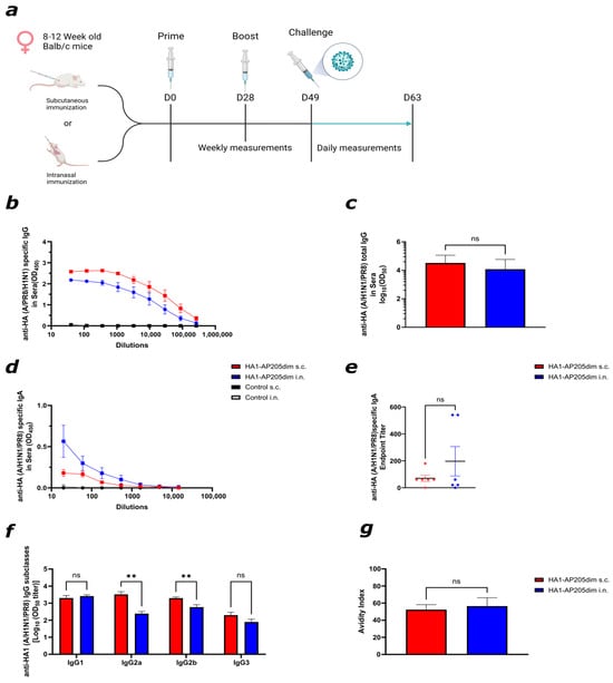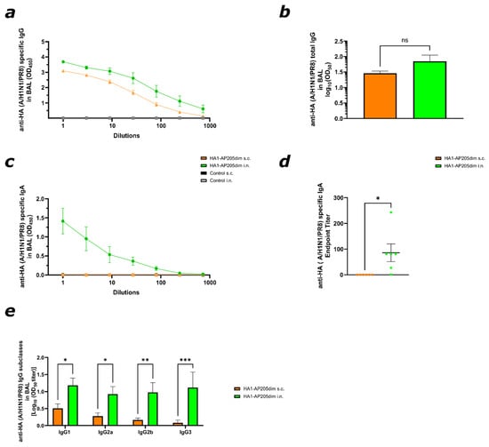 3.3. HA1–AP205dim Induces Local IgG and IgA Responses in the Bronchoalveolar Lavage Fluid