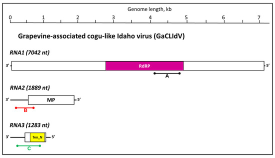 Schematic representation of the three grapevine-associated cogu-like Idaho virus (GaCLIdV) RNA genome components visualized as negative RNA strands. The open reading frames are represented as rectangles, with conserved protein domains designated with colors: RdRP = RNA-dependent RNA polymerase, Ten_N = tenui- and phlebovirus nucleocapsid domain. MP designates “movement protein” identified based on sequence similarity to the P2 protein of other cogu-like viruses. Three primer pairs specific to RNAs 1–3 were used for confirmation of GaCLIdV presence in the grapevine samples, which produced the PCR products A (black line), B (red line), and C (green line) shown under the genome diagrams.