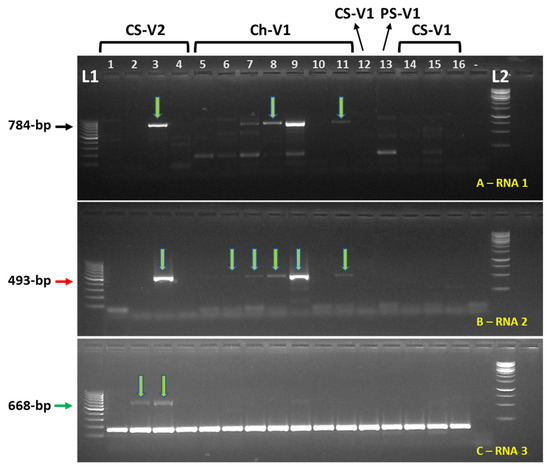 An example of the screening of 16 grapevine samples collected in September 2023 from two vineyards, V1 and V2, in Canyon County of Idaho for analyzing the presence of the grapevine-associated cogu-like Idaho virus (GaCLIdV). Reverse transcription (RT)-PCR was conducted with primer pairs A (784 bp, black arrow), B (493 bp, red arrow), and C (668 bp, green arrow) targeting three separate genome segments of GaCLIdV, see Figure 2 for details. The PCR products were separated in a 1% agarose gel and visualized under UV light after ethidium bromide staining. Lanes representing individual plants are numbered; “-“ designates the negative control (ddH2O). Select PCR bands marked with vertical arrows were Sanger-sequenced and confirmed to represent GaCLIdV sequences. Grapevine cultivar designations: CS = Cabernet Sauvignon; Ch = Chardonnay; PS = Petite Sirah.