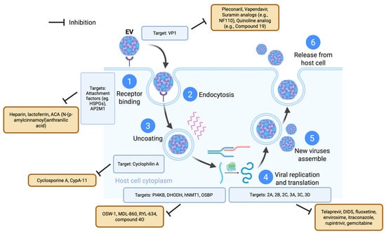 - Anasir, M.I.; Zarif, F.; Poh, C.L. Antivirals blocking entry of enteroviruses and therapeutic potential. J. Biomed. Sci. 2021, 28, 10. [Google Scholar] [CrossRef] [PubMed]