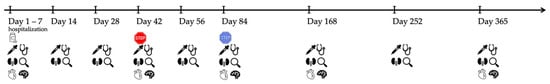 Timeline visualizing the examinations during the hospitalization (day 1–7) and follow-up throughout the study course.