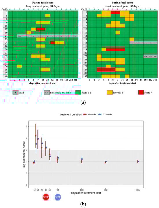 (a) Heatmap visualizing the Purina fecal score in cats throughout the study period in both groups until day 365 (comparison of treatment duration: 42 versus 84 days). A score of ≤4 (green) indicates normal fecal consistency, and a score of 5 or 6 (yellow) indicates mild diarrhea. A score of 7 (red) was defined as severe diarrhea. The red line indicates the end of the treatment period, and the line above the map represents the number of cats with a Purina fecal score equivalent to diarrhea. (b) Timeline visualizing changes in the Purina fecal score of the cats during the treatment with GS-441524 until day 42 (red) or day 84 (blue) and up to day 365 (comparison of treatment duration: 42 versus 84 days). The red stop sign marks the end of treatment of the short treatment group; the blue stop sign marks the end of treatment of the long treatment group. Figures show average predictive values and 95% confidence intervals of each parameter. Grey shading marks the reference interval of the parameters. There was no statistically significant difference in group comparison measured by a median mixed-effects model. The Purina fecal score was log-transformed to correct for strong skewness in its distribution.