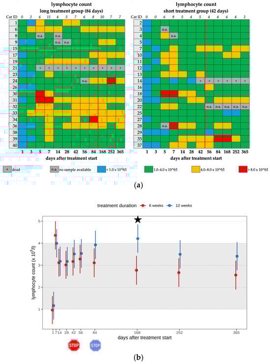 (a) Heatmap visualizing the lymphocyte count in cats throughout the study period in both groups until day 365 (comparison of treatment duration: 42 versus 84 days). Lymphocyte count < 1.0 × 109/L (blue) is defined as lymphopenia, lymphocyte count of 1.0–4.0 × 109/L (green) represents a normal value, lymphocyte count of 4.0–8.0 × 109/L (orange) is defined as mild lymphocytosis, lymphocyte count of >8.0 × 109/L (red) is defined as moderate lymphocytosis. The classification of lymphocytosis grades is based on the publication by Zuzzi-Krebitz et al., 2024 []. The red line indicates the end of the treatment period, and the line above the map represents the number of cats with lymphocytosis. (b) Timeline visualizing changes in lymphocyte counts in cats during the treatment with GS-441524 until day 42 (red) or day 84 (blue) and up to day 365 (comparison of treatment duration: 42 versus 84 days). The red stop sign marks the end of treatment of the short treatment group; the blue stop sign marks the end of treatment of the long treatment group. Figures show average predictive values and 95% confidence intervals of each parameter. Grey shading marks the reference interval of the parameters. Black asterisks indicate statistically significant differences in group comparison (p < 0.05) measured by robust linear mixed-effects model.