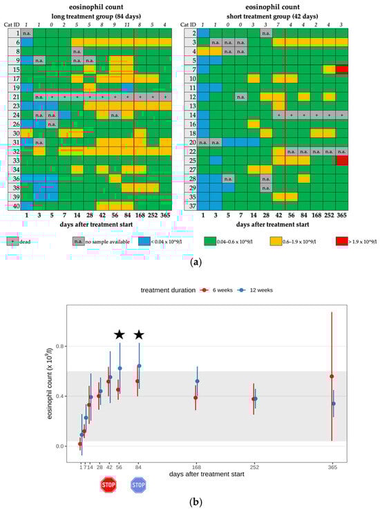 (a) Heatmap visualizing the eosinophil count in cats throughout the study period in both groups until day 365 (comparison of treatment duration: 42 versus 84 days). Eosinophil count < 0.04 × 109/L (blue) is defined as eosinopenia, eosinophil count of 0.04–0.6 × 109/L (green) represents a normal value, eosinophil count of 0.6–1.9 × 109/L (orange) is defined as mild eosinophilia, and eosinophil count of >1.9 × 109/L (red) is defined as moderate eosinophilia. The classification of eosinophilia grades is based on the publication by Zuzzi-Krebitz et al. (2024) []. The red line indicates the end of the treatment period, and the line above the map represents the number of cats with eosinophilia. (b) Timeline visualizing changes in eosinophil counts in cats during the treatment with GS-441524 until day 42 (red) or day 84 (blue) and up to day 365 (comparison of treatment duration: 42 versus 84 days). The red stop sign marks the end of treatment of the short treatment group; the blue stop sign marks the end of treatment of the long treatment group. Figures show average predictive values and 95% confidence intervals of each parameter. Grey shading marks the reference interval of the parameters. Black asterisks indicate statistically significant differences in group comparison (p < 0.05) measured by the median mixed-effects model.