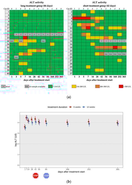 (a) Heatmap visualizing ALT activity in cats throughout the study period in both groups until day 365 (comparison of treatment duration: 42 versus 84 days). ALT activity < 114 U/L (green) represents a normal value, ALT activity of 114–200 U/L (yellow) represents a mild increase, ALT activity of 200–350 U/L (orange) represents a moderate increase, and ALT activity > 350 U/L (red) represents a severe increase. The red line indicates the end of the treatment period, and the line above the map represents the number of cats with increased ALT activity. (b) Timeline visualizing changes in ALT activity of the cats during the treatment with GS-441524 until day 42 (red) or day 84 (blue) and up to day 365 (comparison of treatment duration: 42 versus 84 days). The red stop sign marks the end of treatment of the short treatment group; the blue stop sign marks the end of treatment of the long treatment group. Figures show average predictive values and 95% confidence intervals of each parameter. Grey shading marks the reference interval of the parameters. There was no statistically significant difference in group comparison measured by the robust linear mixed-effects model. ALT activity was log-transformed to correct for strong skewness in its distribution.