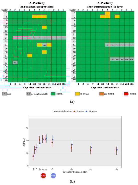 (a) Heatmap visualizing ALP activity in cats throughout the study period in both groups until day 365 (comparison of treatment duration: 42 versus 84 days). ALP activity < 94 U/L (green) represents a normal value, ALP activity of 94–200 U/L (yellow) represents a mild increase, ALP activity of 200–350 U/L (orange) represents a moderate increase, and ALP activity > 350 U/L (red) represents a severe increase. The red line indicates the end of the treatment period, and the line above the map represents the number of cats with increased ALP activity. (b) Timeline visualizing changes in ALP activity of the cats during the treatment with GS-441524 until day 42 (red) or day 84 (blue) and up to day 365 (comparison of treatment duration: 42 versus 84 days). The red stop sign marks the end of treatment of the short treatment group; the blue stop sign marks the end of treatment of the long treatment group. Figures show average predictive values and 95% confidence intervals of each parameter. Grey shading marks the reference interval of the parameters. There was no statistically significant difference in group comparison measured by the robust linear mixed-effects model.