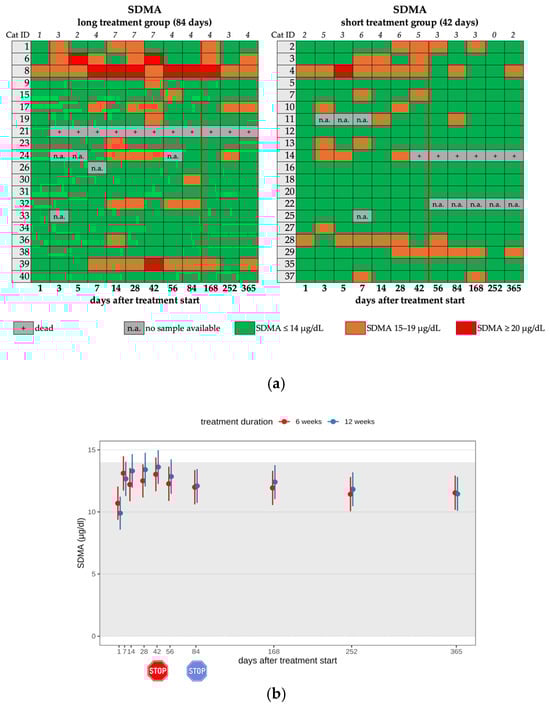 (a) Heatmap visualizing the SDMA levels in cats throughout the study period in both groups until day 365 (comparison of treatment duration: 42 versus 84 days). SDMA levels ≤ 14 µg/dL (green) represent a normal value, SDMA levels of 15–19 µg/dL (orange) represent a mild increase, SDMA levels of ≥20 µg/dL (red) represent a moderate increase. The red line indicates the end of the treatment period, and the line above the map represents the number of cats with increased SDMA levels. (b) Timeline visualizing changes in SDMA levels in cats during the treatment with GS-441524 until day 42 (red) or day 84 (blue) and after discontinuation of treatment up to day 365 (comparison of treatment duration: 42 versus 84 days). The red stop sign marks the end of treatment of the short treatment group; the blue stop sign marks the end of treatment of the long treatment group. Figures show average predictive values and 95% confidence intervals of each parameter. Grey shading marks the reference interval of the parameters. There was no statistically significant difference in group comparison measured by the linear mixed-effects model.