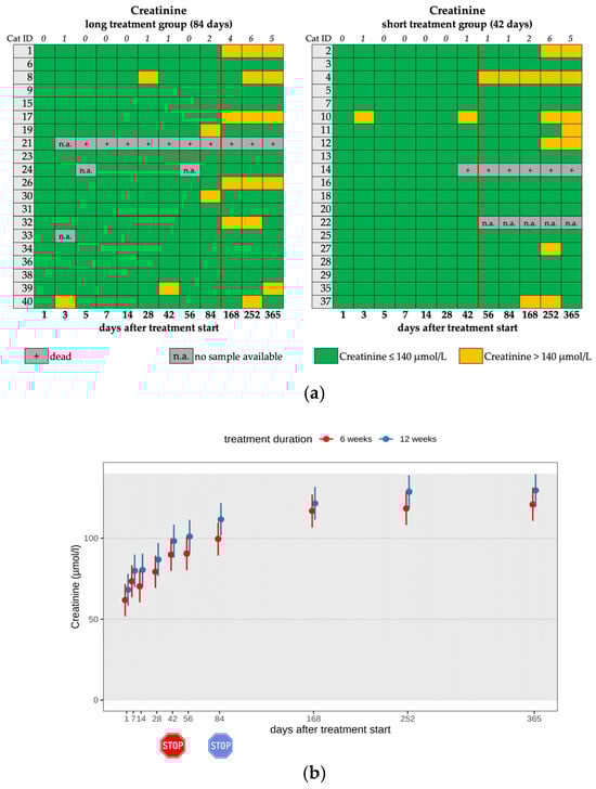 (a) Heatmap visualizing creatinine levels in cats throughout the study period in both groups until day 365 (comparison of treatment duration: 42 versus 84 days). Creatinine levels < 140 µmol/L (green) represent a normal value (according to the IRIS guidelines). Creatinine levels > 140 µmol/L (yellow) represent a mild increase. The red line indicates the end of the treatment period, and the line above the map represents the number of cats with increased creatinine levels. (b) Timeline visualizing changes in creatinine levels in cats during the treatment with GS-441524 until day 42 (red) or day 84 (blue) and up to day 365 (comparison of treatment duration: 42 versus 84 days). The red stop sign marks the end of treatment of the short treatment group; the blue stop sign marks the end of treatment of the long treatment group. Figures show average predictive values and 95% confidence intervals of each parameter. Grey shading marks the reference interval of the parameters. There was no statistically significant difference in group comparison measured by the robust linear mixed-effects model.