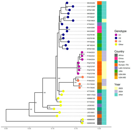 For phylogenetic analysis, complete genome sequences were used when available, while VP1 sequences were analyzed when only partial genomes were accessible. These sequences were aligned with all available GenBank references using MAFFT (version 7.450). Maximum likelihood trees were constructed with IQ-TREE3 (version 3.0.0) using 1000 bootstrap replicates, and the optimal nucleotide substitution model was determined with ModelFinder implemented in IQ-TREE3. An in-house script developed in R programming language (https://www.R-project.org/ accessed on 2 May 2024) was used for tree visualization.
