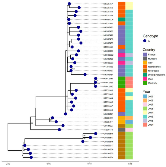 Phylogenetic analysis revealed that all strains belonged to genotype B, with a bootstrap value of 100 and were most closely related to a strain detected in Los Angeles, USA (MF160250, VP4-VP2 region). This strain exhibited a nucleotide similarity exceeding 97.3% with a complete genome sequence from France (PP756376), which had a similarity above 96.6%, both identified in 2014 (Figure 2).