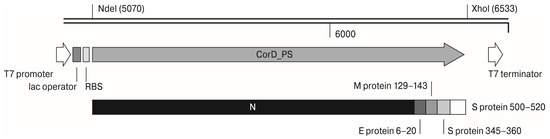 - Kopat, V.V.; Riabchenkova, A.A.; Chirak, E.L.; Chirak, E.R.; Saenko, A.I.; Kolmakov, N.N.; Simbirtsev, A.S.; Dukhovlinov, I.V.; Totolian, A.A. Designing structure and E. coli strain-producer bearing SARS-CoV-2 N, S, M, E protein-related sequence antigen. Russ. J. Infect. Immun. 2023, 13, 653–662. [Google Scholar] [CrossRef]