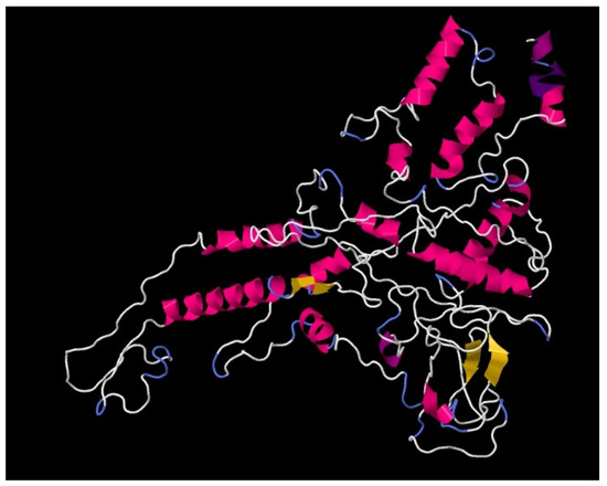 The developed chimeric protein consists of 486 amino acids. Its other values are the following: molar mass 53,059 daltons; isoelectric point (pI) 9.56; hydrophobicity index (GRAVY) −0.785; aliphatic index 61.91; and extinction coefficient 53,860 (1 mg/mL of protein solution has an optical density of 1.02 at 280 nm). A 3D model of the protein is shown in Figure 2.