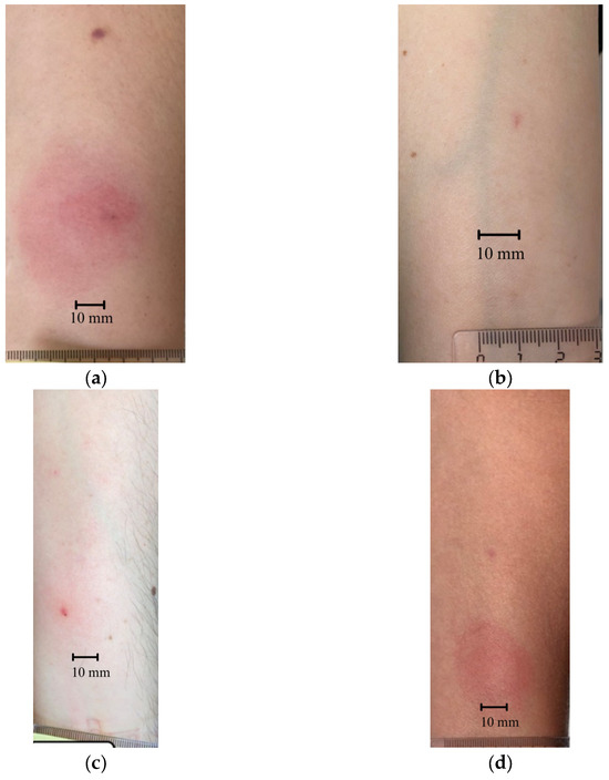 Examples of skin reaction test results: (a) ‘positive’; (b) ‘negative’; (c) ‘false-positive’; (d) ’inconclusive’.