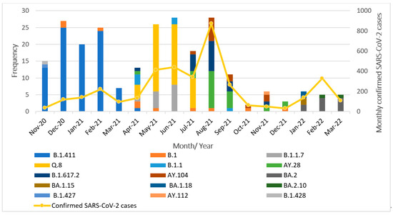 Distribution of SARS-CoV-2 lineages in the study area between November 2020 and March 2022.