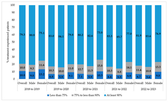 - Puskas, C.M.; Kaida, A.; Miller, C.L.; Zhang, W.; Yip, B.; Pick, N.; Montaner, J.S.G.; Hogg, R.S. The Adherence Gap: A Longitudinal Examination of Men’s and Women’s Antiretroviral Therapy Adherence in British Columbia, 2000–2014. AIDS 2017, 31, 827–833. [Google Scholar] [CrossRef] [PubMed]