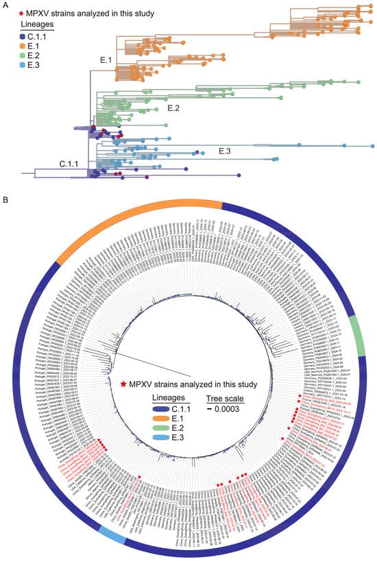 The 2022 global mpox outbreak was predominantly associated with clade IIb lineage B.1 [19], which subsequently underwent substantial diversification into multiple distinct lineages and sub-lineages through cumulative nucleotide substitutions and recombination events across different geographic regions. The lineage B.1.3 evolved into lineages E.1–E.3 via the C.1.1, while lineage B.1.20 further diversified into lineages F.1–F.6 (https://nextstrain.org/mpox/clade-IIb, accessed on 31 March 2025). Among the 21 MPXV strains sequenced from Shenzhen cases, phylogenetic classification showed twenty strains (95.2%) clustered within lineage C.1.1, with a single strain (4.8%) assigned to lineage E.3 (Figure 1A).