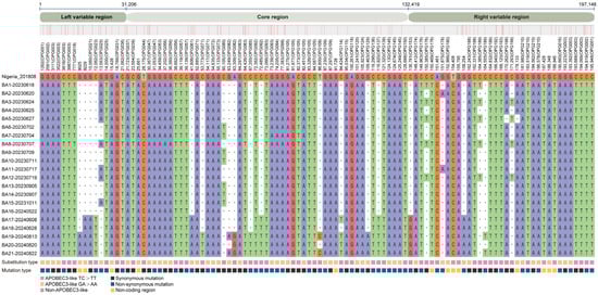 Tandem repeat sequences (TRSs) were identified using Tandem Repeats Finder v4.09 (https://github.com/Benson-Genomics-Lab/TRF, accessed on 12 April 2025) [25] with the following parameters: matching weight 2, mismatching penalty 7, indel penalty 7, and minimum alignment score 50. All candidate TRSs were manually curated to ensure positional accuracy and repeat unit consistency. Nucleotide and amino acid mutations in the 21 MPXV genomes were identified relative to the clade IIb reference genome (NC_063383.1). Mutation sites were extracted and visualized using the Snipit tool v1.6 (https://github.com/aineniamh/snipit, accessed on 12 April 2025). Complete variant information is listed in Table S4.