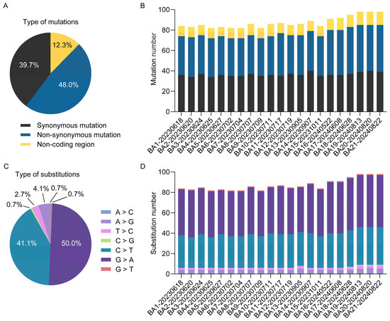 Molecular evolution characteristics of Shenzhen MPXV genomes. The proportions (A) and genomic distribution (B) of mutation types, along with the proportions (C) and distribution (D) of nucleotide substitution types, are presented for 21 Shenzhen MPXV genomes.