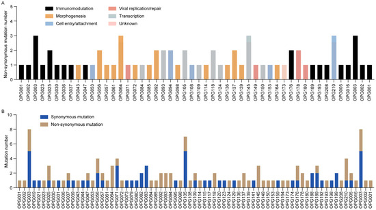 Distribution and functional classification of mutations in Shenzhen MPXV genomes. (A) Bar chart illustrating non-synonymous mutation counts per OPG, color-coded by protein functional category. (B) Stacked bar chart displaying mutation type frequencies across OPGs in 21 MPXV genomes.