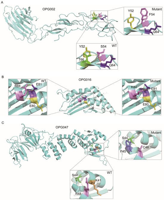 Structural comparison of MPXV proteins harboring critical mutations. Conformational differences between wild-type (WT) and mutant variants of OPG002 (A), OPG016 (B), and OPG047 (C) proteins are presented, with magnified views highlighting mutated residues. Hydrogen bonds and salt bridges are denoted by yellow and green dashed lines, respectively.