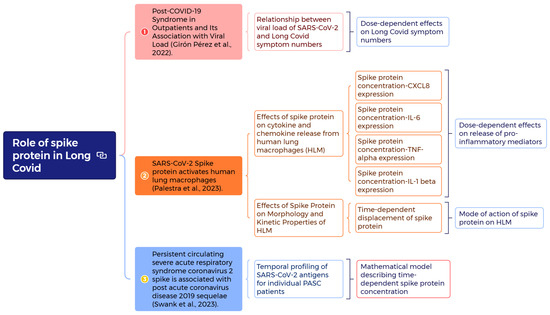 Schematic presents a mind mapping (https://xmind.ai/ (accessed on 5 July 2025)) to investigate the role of spike proteins in Long COVID with analyses of dose–response effects on symptom numbers [22] and proinflammatory mediators [24], the mode of action of spike proteins on Human Lung Macrophages (HLM) [24], and the construction of a mathematical model to describe time-dependent spike protein concentration [23].