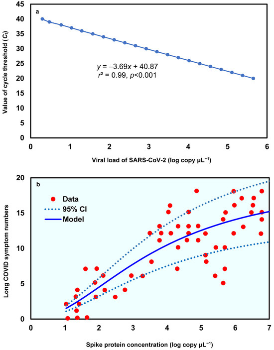 (a) Linear relationship between value of cycle threshold (Ct) and the viral load of SARS-CoV-2 in Gene E and (b) the dose–response relationship between spike protein concentration (log copy μL−1) and Long COVID symptom numbers.