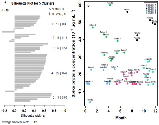 (a) Silhouette plot depicting the quality of cluster assignments based on spike protein concentration levels in 12 Long COVID patients with 48 data points. Each bar represents a patient’s silhouette coefficient, reflecting how similar they are to their own cluster compared to other clusters. Higher silhouette values indicate better-defined and more cohesive clustering, suggesting distinct patterns in spike protein concentration among patient subgroups. (b) Cluster analysis of spike protein concentrations in 12 Long COVID patients identified five distinct clusters based on silhouette scores.