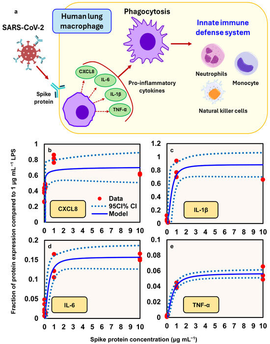 (a) Illustration of the mechanism by which spike proteins induce the release of proinflammatory cytokines (e.g., IL-6, IL-1β, TNF-α) and the chemokine CXCL8 from human lung macrophages (HLMs), promoting phagocytosis and contributing to innate immune responses. Hill models describing the relationship between spike protein concentration (µg/mL) and the relative expression of proinflammatory mediators, expressed as a fraction of the response to 1 µg/mL lipopolysaccharide (LPS): (b) CXCL8; (c) IL-1β; (d) IL-6; (e) TNF-α.
