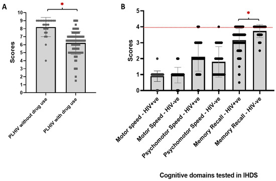 Comparative analysis of the IHDS-based cognitive domains in PLHIV and controls with neurocognitive impairment. The scatter plots display differences in (A) IHDS scores between PLHIVs with and without drug use history, and (B) the scores for three domains assessed in the IHDS test between PLHIV and controls (HIV-negative PWIDs). (A,B) * shows statistically significant differences (p < 0.001) between the groups. Each dot represents the individual score of each study subject, while the bar chart and error bars show the median score for each domain along with the standard deviation. (B) The red line indicates the maximum score achievable for each domain.