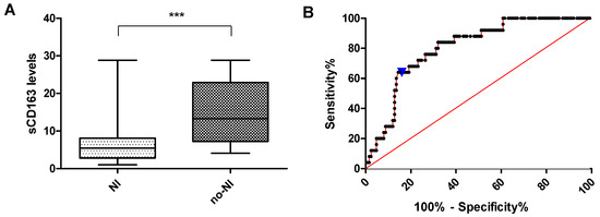 Plots comparing sCD163 levels between PLHIV with and without NCI. (A) The y-axis on the Box and whisker plot represents sCD163 levels (ng/mL); the x-axis denotes neurocognitive status. NI = NCI; no-NI = no NCI. *** = p < 0.0001. (B) ROC curve evaluating the diagnostic performance of sCD163 for NCI status in PLHIV. The blue inverted triangle shows the optimal threshold.