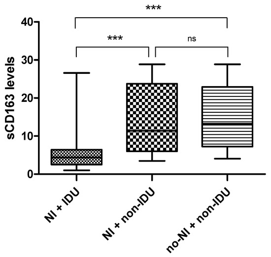 Box and whisker plot comparing sCD163 levels in PLHIV with and without NCI and no IDU history. The y-axis represents sCD163 levels; the x-axis denotes neurocognitive status and IDU history. NI + IDU = NCI with IDU history; NI + non-IDU = NCI without IDU history vs. no-NI + non-IDU = no NCI without IDU history. *** = p < 0.001; ns = not statistically significant.