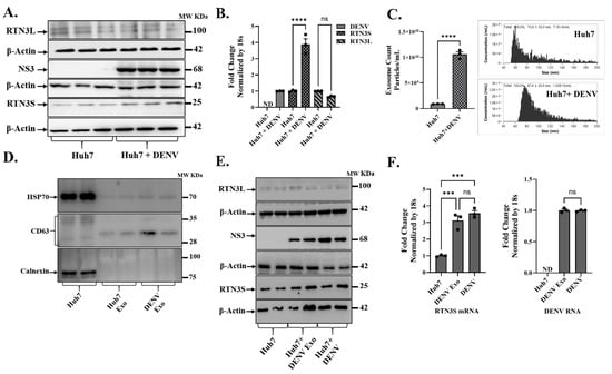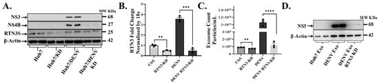 Flaviviruses can remodel the endoplasmic reticulum (ER) into replication organelles and exploit endosomal trafficking to release infectious exosomes carrying viral genomes. This vesicular route can aid in subverting extracellular immunity and enables receptor-independent viral spread. Recently, we showed that the ER-shaping protein Reticulon-3 (RTN3), particularly its short isoform (RTN3S), can modulate flavivirus replication complexes and drive exosomal export of infectious hepatitis C virus RNA. Whether the Dengue virus similarly recruits RTN3S or other RTN3 variants to regulate infectious exosome biogenesis remains unknown. In human Huh7 cells, DENV infection induced a pronounced increase in the expression of the short isoform of RTN3 (RTN3S) protein (Figure 1A and Figure S1A), with a concurrent moderate change in the long isoform (RTN3L) (Figure 1A and Figure S1B). Western blots showed that RTN3S (~25 kDa) levels were low or barely detectable in uninfected cells but became upregulated upon infection, whereas RTN3L (~100 kDa) exhibited no change in expression. The viral NS3 protein (68 kDa) was readily detected only in infected cells, confirming active DENV replication (Figure 1A). Consistent with protein data, RT-qPCR (Figure 1B) indicated that DENV infection drove a significant rise in RTN3 mRNA levels. In infected Huh7 cultures, RTN3 transcripts (Figure 1B) precisely short isoform, were elevated ~3–4-fold relative to uninfected controls (p < 0.0001), while DENV genomic RNA was abundant only in infected cells (undetectable in controls).