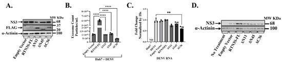 Having established that endogenous RTN3 is important for viral exosomal release, we next investigated whether augmenting or altering RTN3 can modulate this process. We overexpressed RTN3S and several deletion mutants in DENV-infected Huh7 cells to pinpoint domains required for viral cargo packaging into exosomes (Figure 3). The constructs included full-length RTN3S (RTN3S-FL) with a FLAG tag, two N-terminal truncation mutants (ΔN11 and ΔN45, lacking the first 11 or 45 amino acids, respectively), and a C-terminal truncation mutant (ΔC36, lacking the last 36 amino acids). All plasmid constructs were expressed to comparable levels, as confirmed by anti-FLAG immunoblots (Figure 3A). Full-length RTN3S-FL migrated at the expected size (~25 kDa), while the N- and C-terminal deletions showed slightly reduced molecular weight bands (consistent with their truncated sizes). DENV NS3 protein was present in all infected cultures, but its abundance differed depending on the RTN3 construct. Notably, cells overexpressing full-length RTN3S supported higher NS3 levels than empty-vector controls, whereas expression of the ΔC36 mutant correlated with a reduction in NS3 accumulation (Figure 3A).