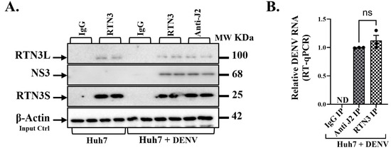 RTN3 is associated with Dengue viral double-stranded RNA and NS3 protein in infected Huh7 cells. (A) Western blot of the IP eluates from Huh7 + DENV lysates. Lanes: IgG IP (Huh7 + DENV), RTN3 IP (Huh7 + DENV), and anti-dsRNA (J2) IP (Huh7 + DENV), with input lysate as control. Blots were probed for RTN3L (~100 kDa), DENV NS3 (~68 kDa), and RTN3S (~25 kDa). (B) RT-qPCR detection of DENV genomic RNA in immunoprecipitated material from Huh7 cells 72 h after DENV infection. Cell lysates were immunoprecipitated with anti-RTN3 or anti-dsRNA (J2) antibodies; non-specific IgG was used as a negative control. Bars show relative enrichment of viral RNA in each IP (normalized to input). Data (B) are mean ± SEM of ≥3 experiments; significance by ANOVA or t-test (ns = not significant).