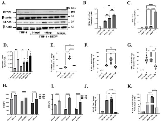 Dengue virus induces RTN3 expression, exosome release, and innate immune responses in THP-1 monocytes. (A) Western blot of THP-1 cells uninfected (Ctrl) or infected with DENV for 24, 48, or 72 h. Blots were probed for RTN3L (~100 kDa) and RTN3S (~25 kDa), with β-Actin (~42 kDa) as a loading control. (B) RT-qPCR of DENV genomic RNA in THP-1 cells (normalized to 18S) at each time point. (C) Flow cytometry of THP-1 cells for DENV NS3. (D) NanoFCM evaluation of exosomes in THP-1 culture supernatants with and without DENV infection. (E–G) RT-qPCR of THP-1 mRNA (normalized to 18S) for exosome biogenesis, trafficking genes, and chaperone protein: (E) CHMP2A, (F) RAB7A, and (G) HSPA5. (H,I) Flow cytometry quantification of monocyte markers. Bars show the percentage of cells expressing CD14 or CD16 in mock vs. DENV samples. (J,K) RT-qPCR of cytokine mRNAs: CXCL10 and IFN-β (normalized to 18S). Data (A–I) are mean ± SEM of triplicates; significance by ANOVA or t-test (ns = not significant, * p < 0.05, ** p < 0.01, *** p < 0.001, **** p < 0.0001).
