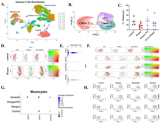 We retrieved publicly available single-cell RNA sequencing (ScRNA-seq) data from peripheral blood mononuclear cells (PBMCs) of healthy individuals (C), Dengue patients (D), Dengue warning signs (DWS), and severe Dengue patients (SD). These datasets were obtained from the Gene Expression Omnibus (GEO) database, which is owned and operated by the National Center for Biotechnology Information (NCBI), a part of the National Library of Medicine (NLM) at the National Institutes of Health (NIH) in the United States. The GEO database is a public archive and resource for gene expression data. Specifically, we used datasets with accession code GSM6833297. A total of 4 healthy controls, 8 Dengue, 4 DWS, and 8 SD patients were included. Analyses were performed using Seurat (v5.1.0). Cells expressing 200–5000 genes, <40,000 counts, and <5% mitochondrial transcripts were retained (n = 154,220). Data was normalized (LogNormalize), top 2000 variable genes identified, and PCA was applied (top 20 PCs). UMAP and clustering (resolution = 0.4) followed. Cell types were annotated using SingleR and the Human Primary Cell Atlas. For monocyte re-clustering (n = 27,169), standard preprocessing was repeated. Differential gene expression between groups was determined using the Wilcoxon test (p < 0.05, avg_logFC threshold applied).